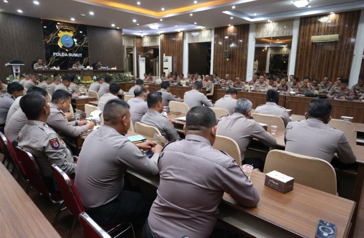 kunjungan tim supervisi dari Badan Pemelihara Keamanan (Baharkam) Polri dalam rangka pelaksanaan kegiatan supervisi terhadap fungsi Samapta dan Pengamanan Objek Vital (Pam Obvit). Kegiatan berlangsung pada Selasa, 28 Oktober 2025, sejak pukul 08.00 WIB, di Aula Catur Prasetya Polda Sumut.(Istimewa)