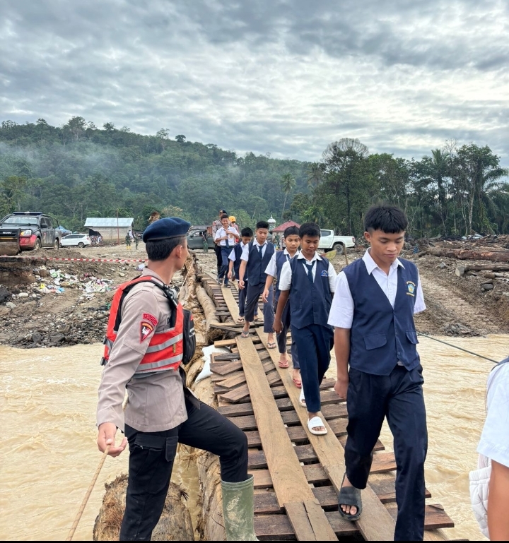 Di tengah kondisi infrastruktur yang belum sepenuhnya pulih, personel Brimob tidak hanya menyediakan sarana transportasi, tetapi juga dengan sigap membantu siswa-siswi menyeberangi jembatan sementara yang dibangun pascabanjir bandang. Langkah ini dilakukan demi memastikan anak-anak tetap dapat mengikuti kegiatan belajar mengajar dengan aman dan tepat waktu.