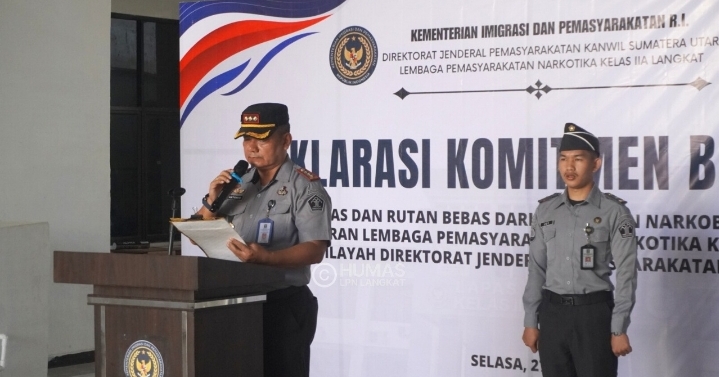 Langkat, Relasipublik.com- Lembaga Pemasyarakatan (Lapas) Narkotika Kelas IIA Langkat Kantor Wilayah Direktorat Jenderal Pemasyarakatan (Kanwil Ditjenpas) Sumatera Utara menggelar Apel Bersama dalam rangka Deklarasi Komitmen Bersama Menciptakan Lapas dan Rutan bebas dari peredaran narkoba dan telepon genggam ilegal yang dipimpin langsung oleh Kepala Lapas (Kalapas) Tapianus Antonio Barus. Kegiatan yang berlangsung di Aula Terbuka Lapas diikuti oleh seluruh jajaran Pejabat Struktural, JFT dan JFU Lapas Narkotika Langkat pada Senin, (27/05/2025).