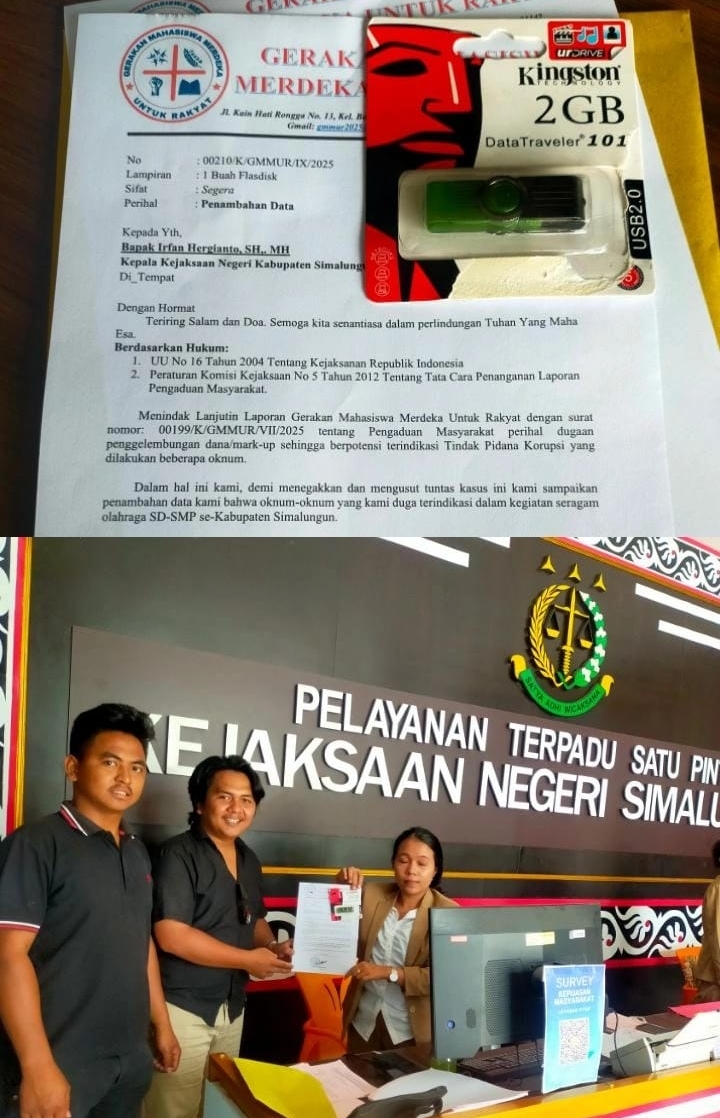 Simalungun, Relasipublik.com-Gerakan Mahasiswa Merdeka Untuk Rakyat (GMMUR) kembali hadir ke kejaksaan negeri Simalungun (22/09/2025) Pasca Aksi Demonstrasi untuk memberikan data tambahan berupa Vidio dan Foto terkait Dugaan Pemerasan dan Korupsi dalam Pengadaan Baju olahraga SD-SMP di Kabupaten Simalungun.