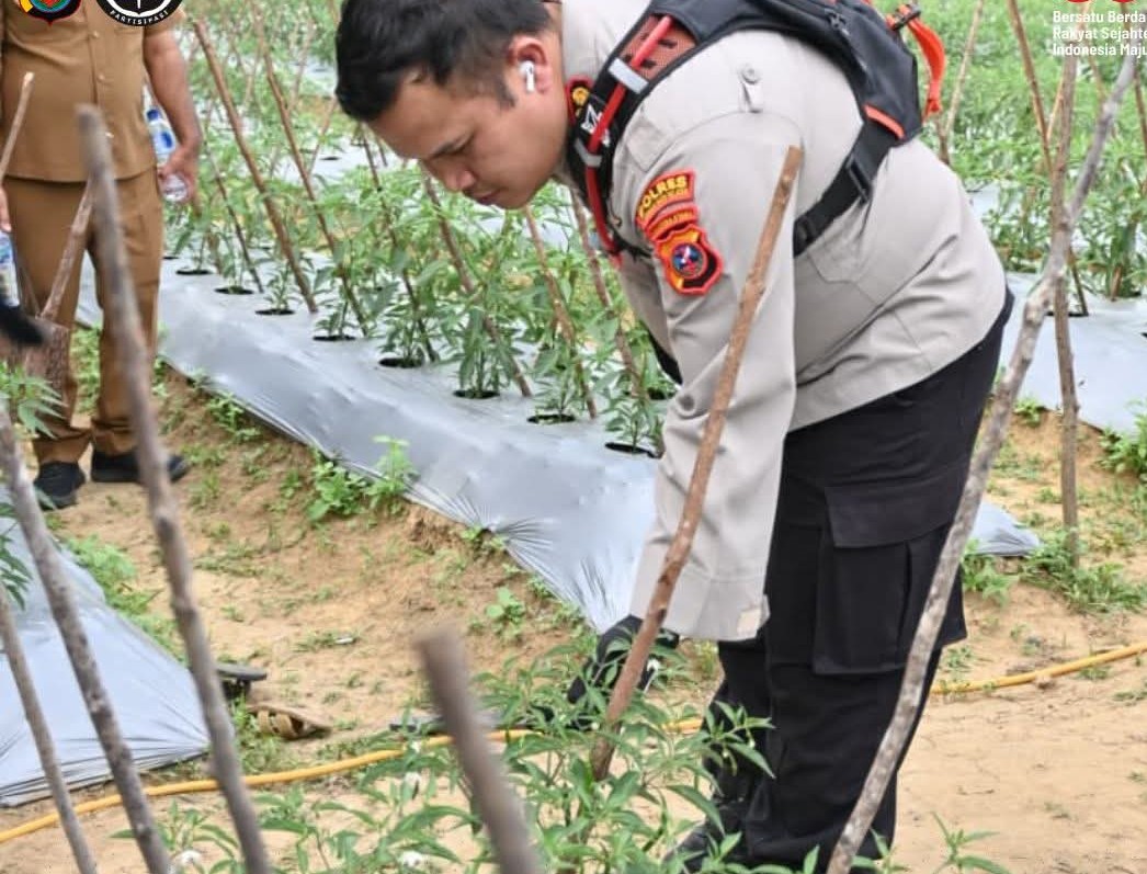 Mereka meninjau lahan pertanian cabai milik warga, menyerahkan alat semprot elektrik dan pupuk organik kepada petani, serta berdialog dengan masyarakat.