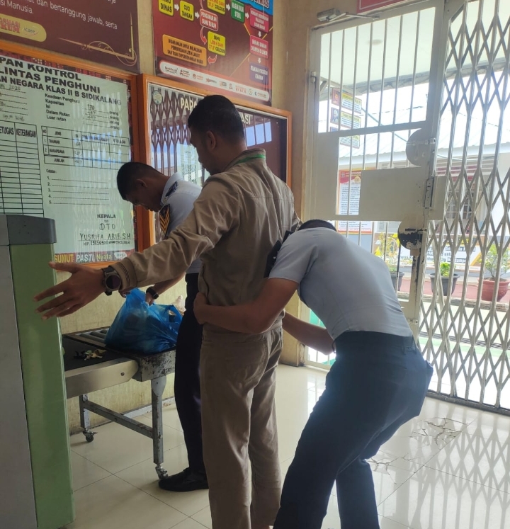 Sidikalang, Relasipublik.com-Rutan Sidikalang berkomitmen untuk selalu memastikan situasi dan kondisi di dalam Rutan selalu dalam keadaan aman . Untuk mengantisipasi masuknya barang barang terlarang , Petugas melaksanakan penggeledahan bagi siapa saja yang ingin masuk ke dalam rutan .