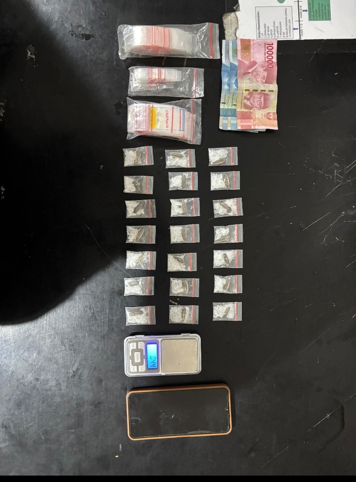 Saat dilakukan penggeledahan, petugas menemukan sejumlah barang bukti yang diduga kuat sebagai barang haram, yaitu 21 (dua puluh satu) bungkus plastik klip sedang diduga berisi Narkotika jenis Sabu berat total (Brutto 32,75 Gram), 1 (satu ) unit Hp Android merk Vivo, 1 (satu) unit timbangan digital, 3 (tiga) bal plastik klip kosong, Uang tunai diduga hasil penjualan Rp 200.000.