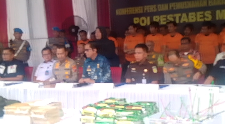 Barang bukti yang dihadirkan berupa sabu dan jenis narkoba lainnya seperti ganja, Vape yang berisi Kokain dan puluhan orang orang tersangka dihadirkan, serta BB tersebut untuk dimusnahkan dengan mobil khusus yang dilakukan dilapangan tengah Mapolrestabes Medan.