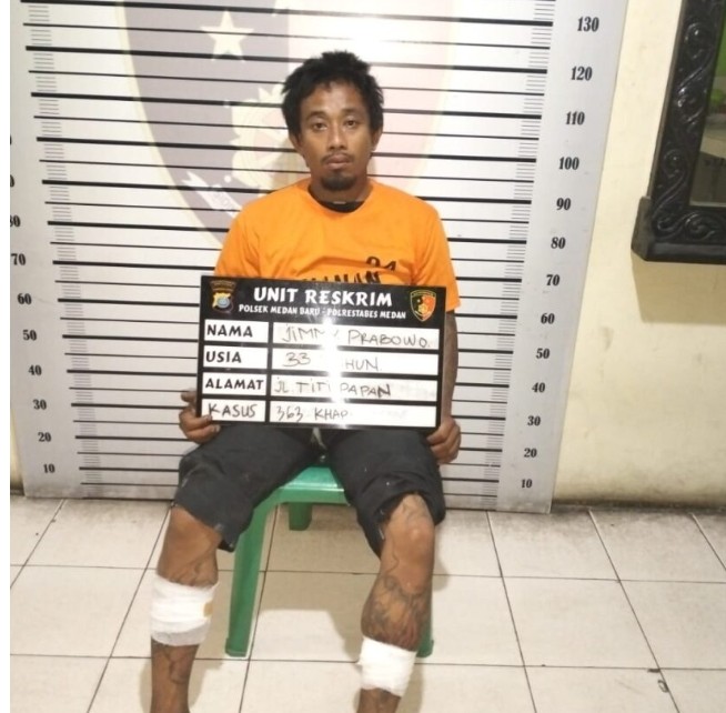MEDAN// relasipublik.com- Residivis pelaku spesialis bongkar rumah dan curi pagar besi berinisial JP diamankan di Polsek Medan Baru, usai kedua kakinya ditembak polisi.