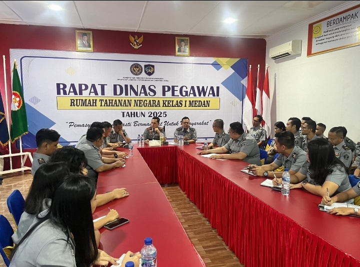 Medan//relasipublik.com- Guna meningkatkan kualitas layanan dan pembinaan warga binaan dan masyarakat, Rumah Tahanan Negara (Rutan) Kelas I Medan Kanwil Ditjenpas Sumut menggelar Rapat Dinas penguatan tugas dan fungsi serta percepatan pencapaian target kinerja pada masing-masing seksi bulan Mei. Senin (19/5).
