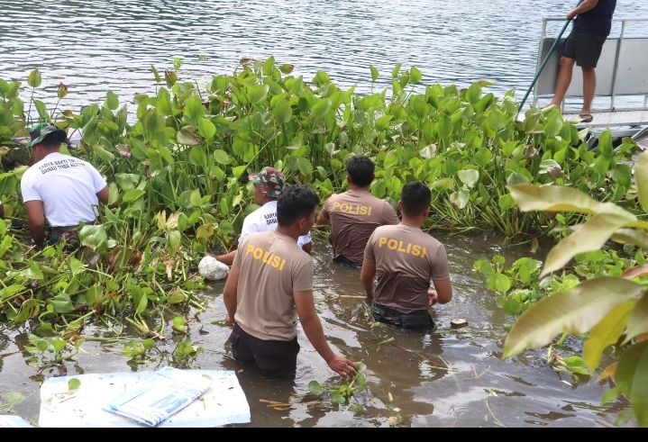 Para peserta membersihkan eceng gondok, sampah plastik, dan limbah lainnya di pinggir danau sambil memberikan edukasi pentingnya menjaga kelestarian ekosistem.