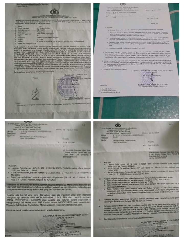 Ibu Liping telah hadir dalam surat pemanggilan dari Polrestabes Medan tanggal 14 April 2025 tahap Penyelidikan untuk memberi keterangan laporannya atas kasus pencemaran nama baiknya yang di lakukan Ibu AI BIE.